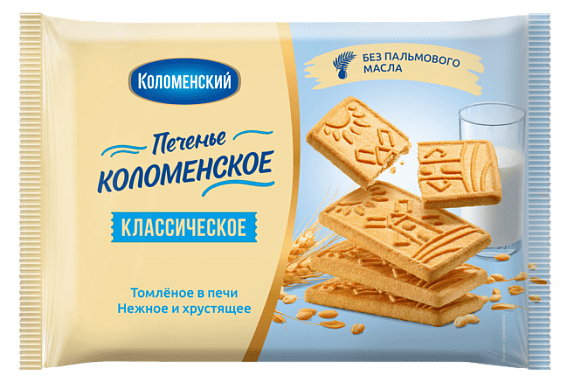 Нежное и хрустящее печенье “Коломенское” выпекается по особой итальянской технологии и обладает тающей во рту текстурой. Рецептуры печенья соответствуют современным трендам и обогащены полезными веществами. Печенье не содержит пальмового масла или маргарина на основе пальмового масла. Высокоолеиновое подсолнечное масло, на котором сделано печенье, при высоких температурах выпечки не образует транс-жиров, содержит природный антиоксидант витамин Е, Омега-3 и Омега-9. Вкус печенья максимально приближен к домашнему.