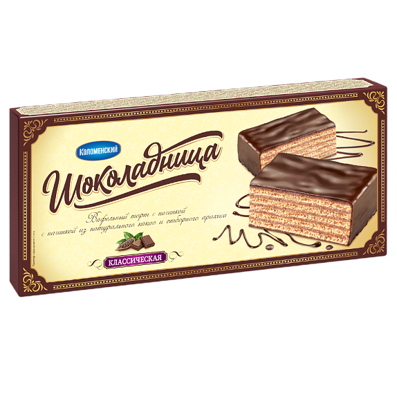 Вафельный торт Шоколадница «Классический» представляет собой сочетание хрустящих вафель и нежного пралине, торт покрыт темной глазурью.