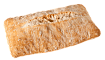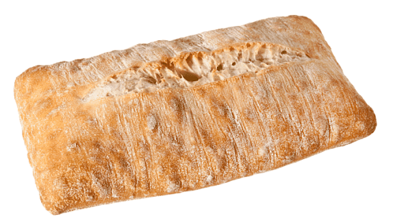 Невероятно мягкий итальянский пшеничный хлеб Чиабатта с крупной пористостью и по-настоящему «деревенской внешностью»: продольный надрез раскрывающий пористый мякиш и присыпанная мукой хрустящая корочка.